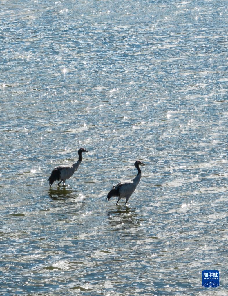 9月16日在多慶湖邊拍攝的黑頸鶴(無人機照片)。新華社記者 晉美多吉 攝