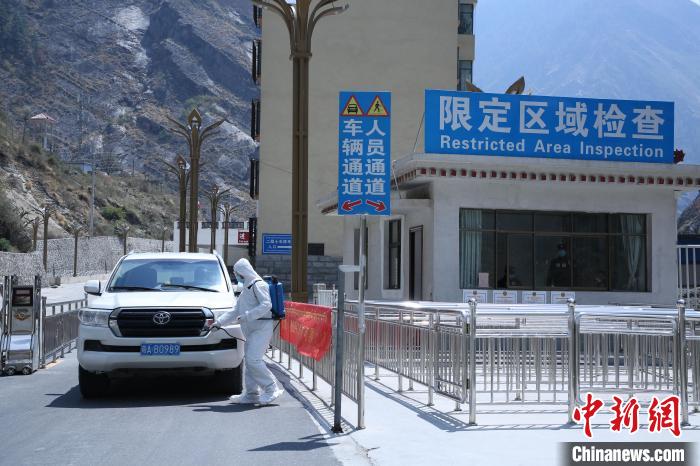 吉隆出入境邊防檢查站移民管理警察對外出口岸限定區(qū)域車輛進行消毒。 肖富貴 攝