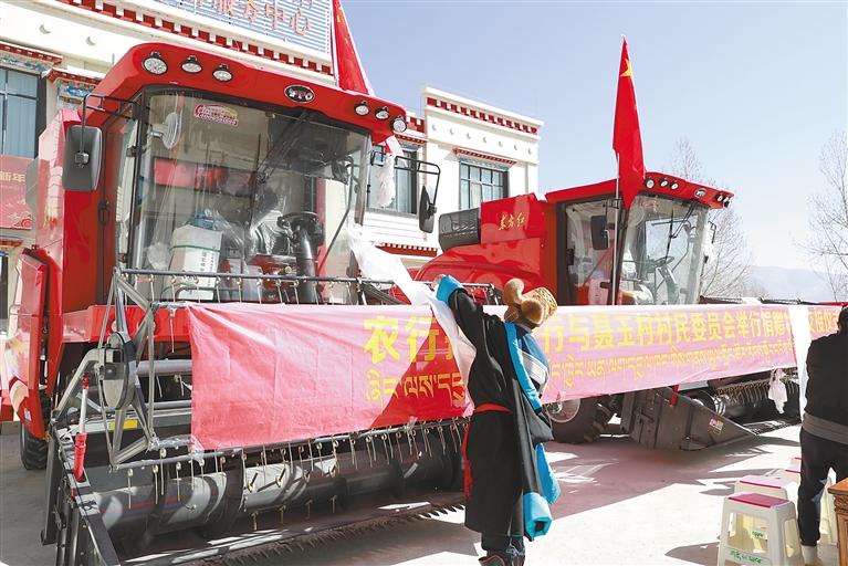 農(nóng)行拉薩分行向該行駐村點(diǎn)尼木縣聶玉村捐贈大型收割機(jī)。
