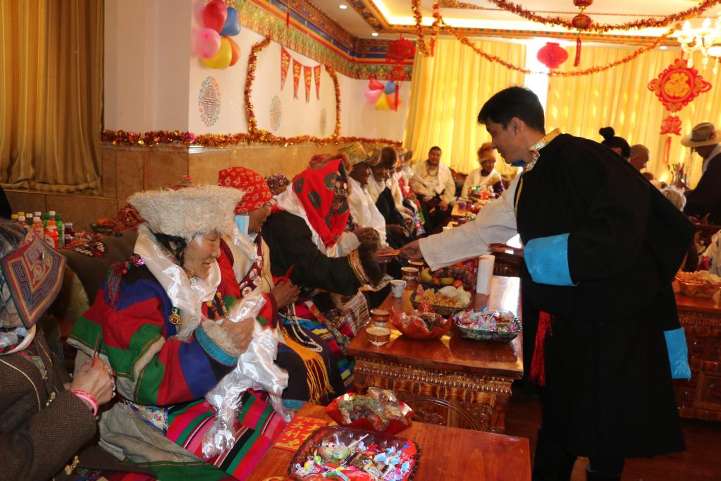 阿里地區(qū)特困人員集中供養(yǎng)服務(wù)中心的老人們?cè)跉g度藏歷新年。(2022年3月2日攝,新華社發(fā))