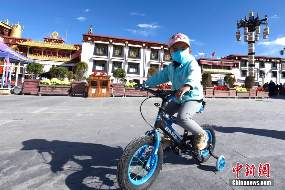 11月17日,藏族小女孩德慶拉姆在大昭寺前騎行。中新社記者 李林 攝