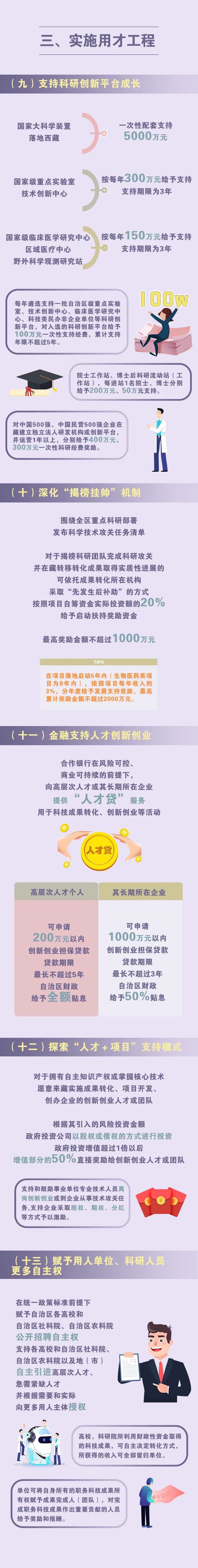 支持科研創(chuàng)新平臺(tái)成長(zhǎng),對(duì)重點(diǎn)實(shí)驗(yàn)室、技術(shù)創(chuàng)新中心以及院士工作站、博士后科研流動(dòng)站(工作站)等給予經(jīng)費(fèi)支持。深化“揭榜掛帥”機(jī)制,對(duì)完成科研攻關(guān)并在藏轉(zhuǎn)化成果取得實(shí)質(zhì)性進(jìn)展的,給予啟動(dòng)扶持獎(jiǎng)勵(lì)資金、發(fā)展支持獎(jiǎng)勵(lì)資金。向高層次人才或其長(zhǎng)期所在企業(yè)提供“人才貸”服務(wù),自治區(qū)財(cái)政予以貼息。鼓勵(lì)創(chuàng)新創(chuàng)業(yè)人才或團(tuán)隊(duì)來藏實(shí)施成果轉(zhuǎn)化、項(xiàng)目開發(fā)、創(chuàng)辦企業(yè),政府投資公司參與創(chuàng)新創(chuàng)業(yè)項(xiàng)目,政府投資增值的部分收益可直接用于獎(jiǎng)勵(lì)。在統(tǒng)一政策標(biāo)準(zhǔn)、嚴(yán)格執(zhí)行規(guī)定前提下,賦予用人單位、科研人員更多自主權(quán)。