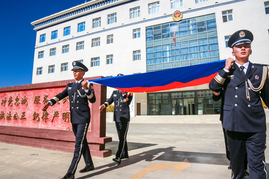 圖為拉薩鐵路公安民警高擎警旗走過(guò)“四句話、十六字”訓(xùn)詞前。單義倫攝