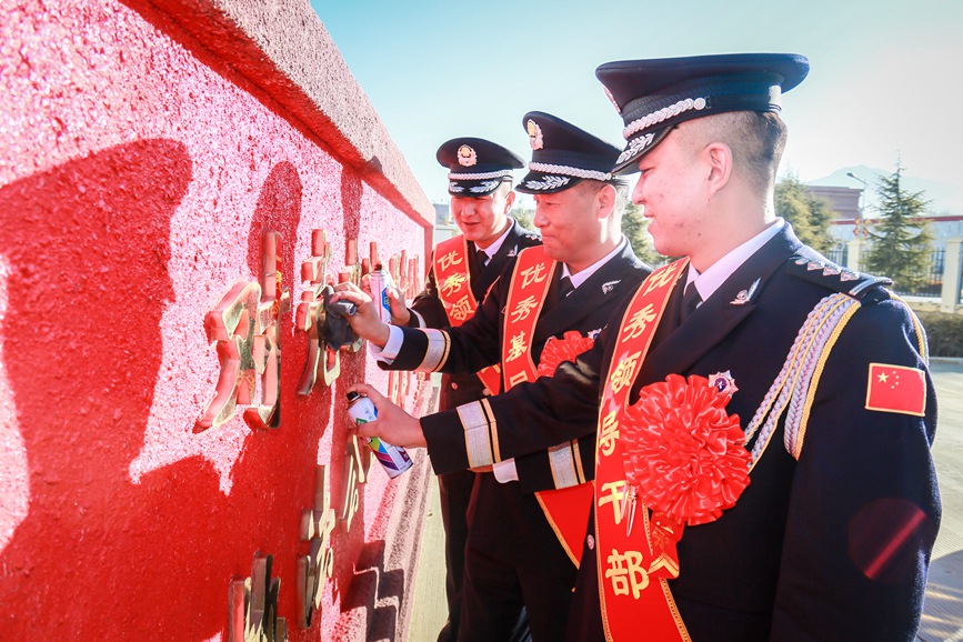 圖為1月10日,拉薩鐵路公安處功模代表共同為“四句話、十六字”訓(xùn)詞墻描紅,擦亮忠誠(chéng)底色。胡傳鑫攝
