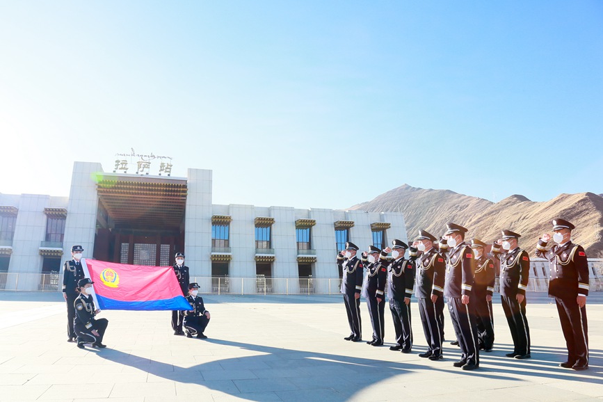 圖為1月9日,拉薩站派出所民警迎著朝陽(yáng)面向警旗重溫入警誓詞。湯成俊攝