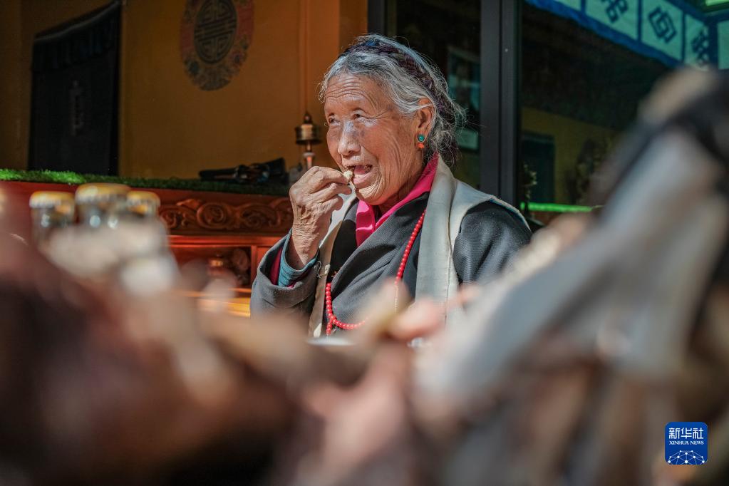 次旦老人接過孫女敬獻(xiàn)的切瑪(1月22日攝)。新華社記者 晉美多吉 攝