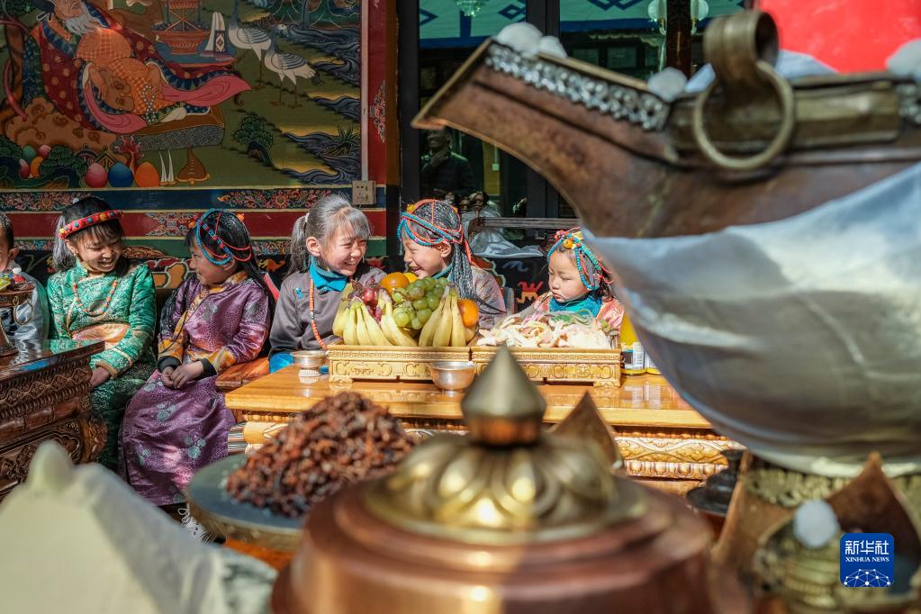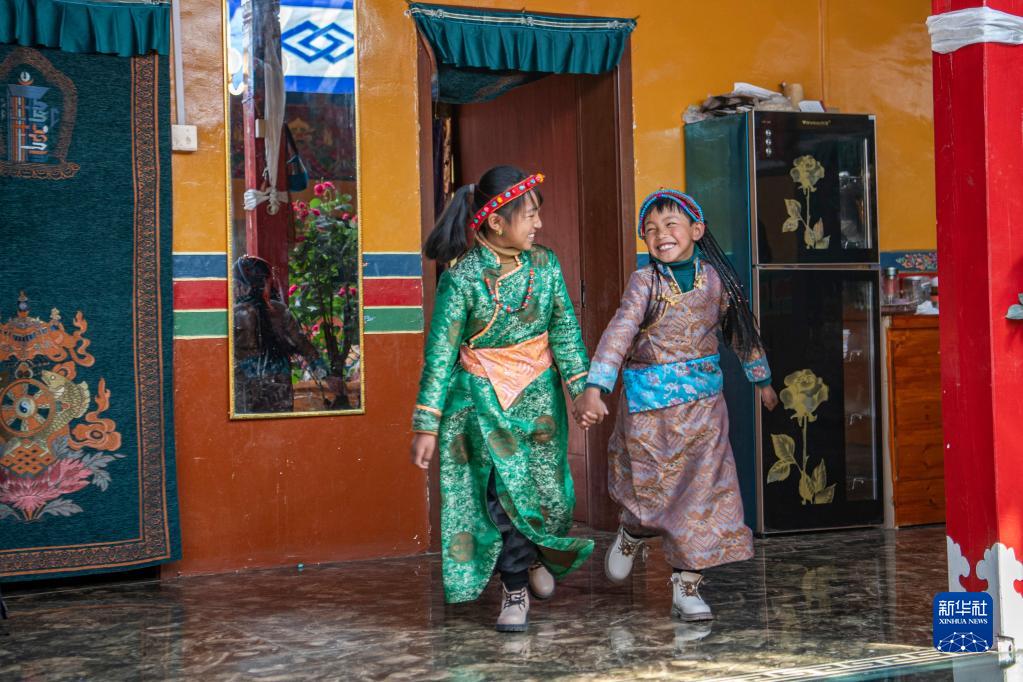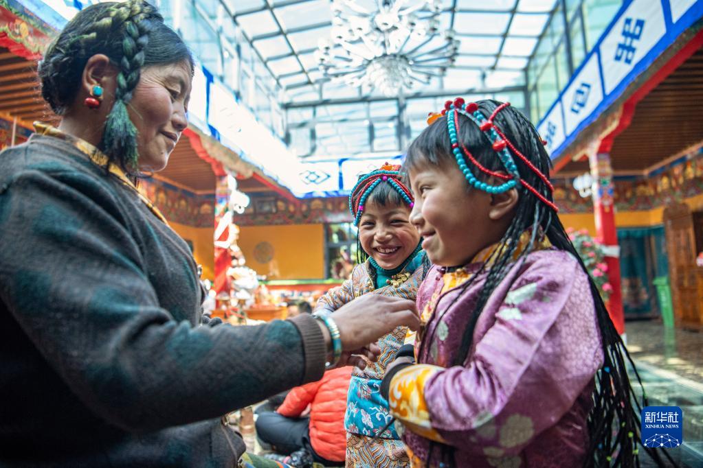 今年,日喀則藏歷農(nóng)家年和春節(jié)“巧遇”同一天,雖習(xí)俗不同,但年味皆濃。次旦的兒孫早早開車去縣城采買了年貨,兒媳婦們在家準(zhǔn)備過年吃的羊頭、切瑪?shù)葌鹘y(tǒng)特色美食。家中的第四代,次旦老人的重孫子和重孫女們,則穿上了漂亮的藏裝,頭戴綠松石點(diǎn)綴的頭飾,在家中歡快地跑來跑去。