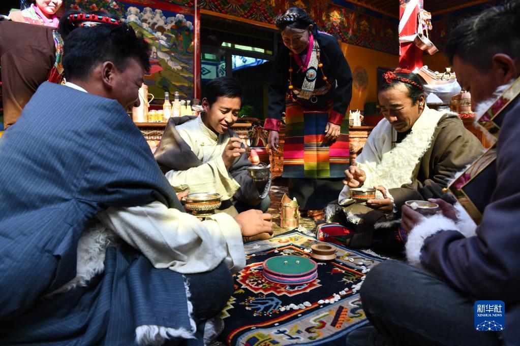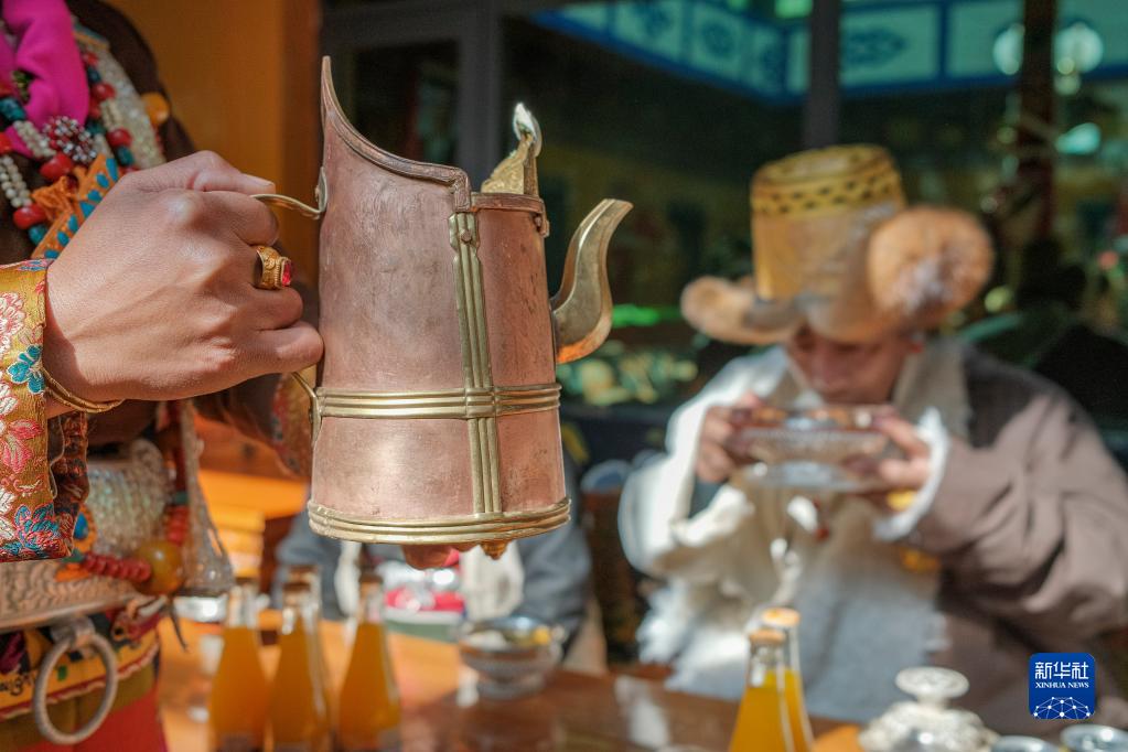 次旦老人的孫女給家人敬上青稞酒(1月22日攝)。新華社記者 孫非 攝