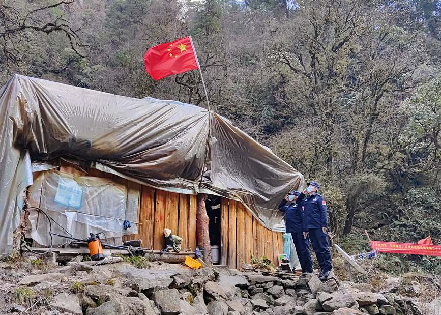 圖為春節(jié)前夕,拉郊邊境派出所移民管理警察王彥凱(左一)與同事為執(zhí)勤點更換新國旗后,向國旗敬禮。伊比熱恨攝