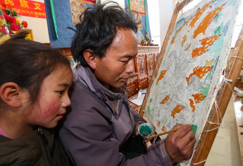 嘎桑堅(jiān)參(右)在為唐卡上色(1月11日攝)。新華社記者 姜帆 攝