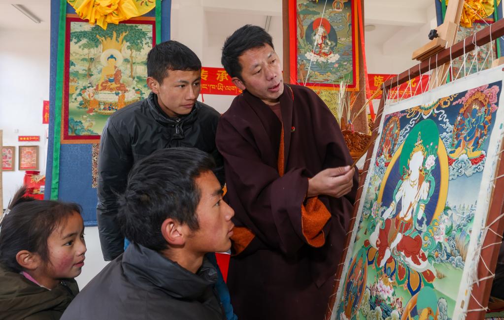 西繞尼瑪(右一)在講解關(guān)于唐卡繪制的知識(1月11日攝)。新華社記者 姜帆 攝