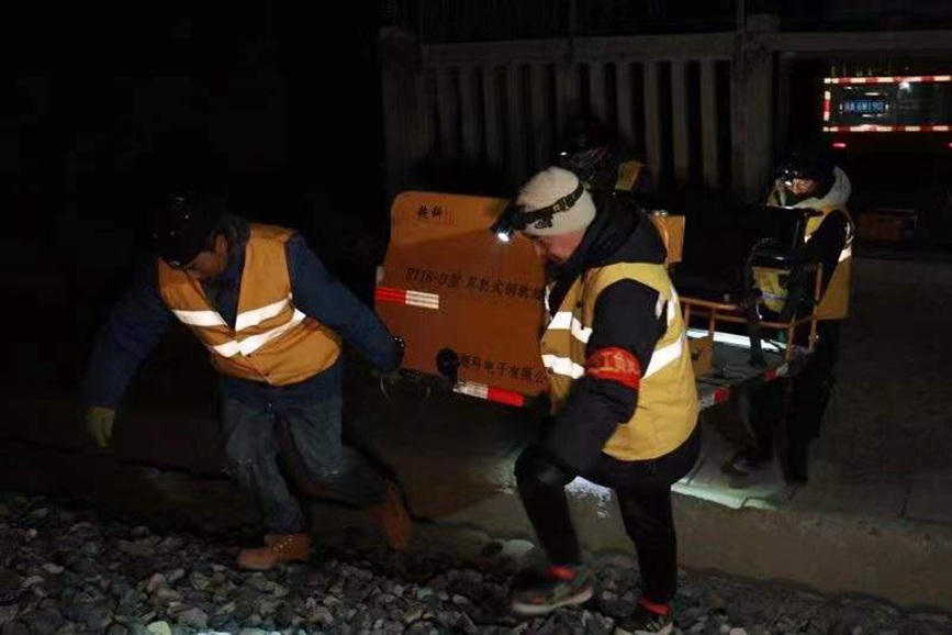 “大家?guī)Ш霉ぞ卟牧?,準備出發(fā)?!?2時整,隨著作業(yè)負責(zé)人探傷工區(qū)工長羅布一聲令下,呼嘯的寒風(fēng)中,黃色的“迷你敞篷車”緩緩啟動,載著4名職工,開始了當(dāng)晚對拉林鐵路20多公里線路的探傷檢查任務(wù)。