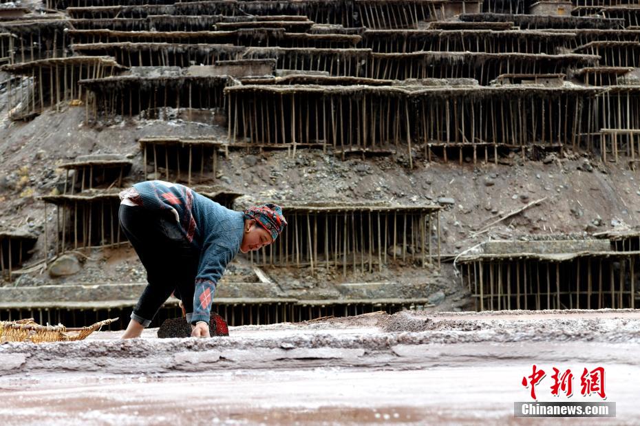 2月13日,西藏昌都芒康縣納西民族鄉(xiāng)加達村村民珍羅正在掃鹽。