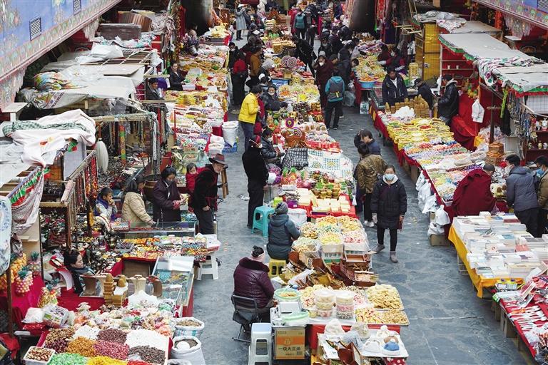 藏歷新年臨近,拉薩街頭置辦年貨的人群熙熙攘攘,大街小巷張燈結彩,古城街巷洋溢著濃濃的年味兒。八廓商城年貨會、沖賽康批發(fā)市場作為置辦年貨的首選地,從早到晚都是商賈云集、人聲鼎沸,一番熱鬧景象。