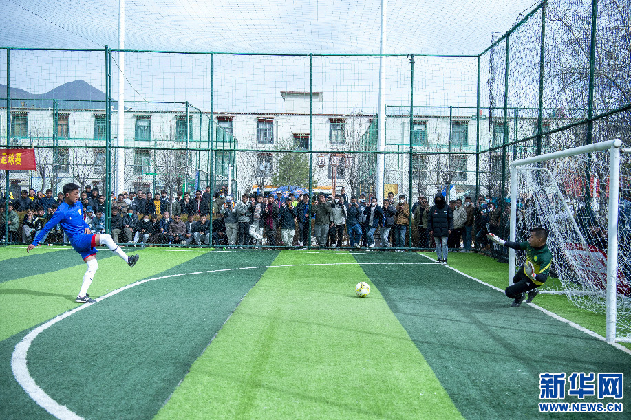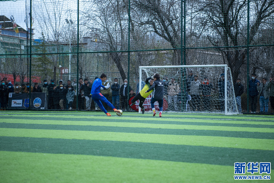 2月14日,巔炯邁瓦隊球員西繞加措在門前抽射。 新華網(wǎng) 旦增努布 攝