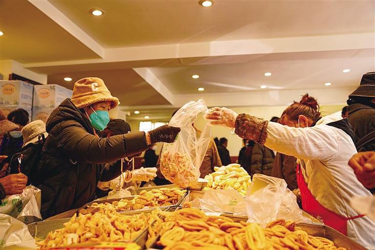 不遠(yuǎn)處,尼珍藏式卡塞店的店員們正忙著制作“卡塞”,揉面、切割、染色,面片經(jīng)店員們的巧手捏成長條形、圓形、蝴蝶形等不同樣式,最后放到油鍋炸至金黃,出鍋后瀝油再撒上白糖,香甜可口、樣式精美的卡塞就制作完成了。新鮮出爐的卡塞顏色金黃、香氣四散開來,市民們爭相選購?!拔覀冏隹ㄈ呀?jīng)25年了,今年1月10日開門營業(yè),很多老顧客就來光顧了,每天收入在2000元至3000元之間,而且我們選用的原材料比較好,再加上現(xiàn)場制作、新鮮銷售,生意好的時(shí)候賣得更多。”老板尼珍告訴記者:“我們店制作的卡塞價(jià)格實(shí)惠,連續(xù)8年沒有漲價(jià),每斤30元,今年準(zhǔn)備營業(yè)到藏歷十二月二十九(公歷2月19日)歇業(yè)?!?/p>