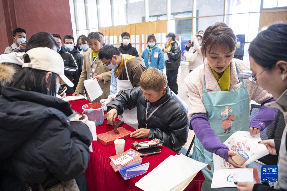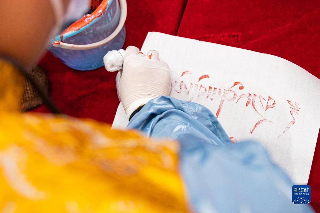 2月22日,西藏博物館工作人員將刻有“扎西德勒”的木刻印刷在紙上。新華社發(fā)(丁增尼達(dá) 攝)