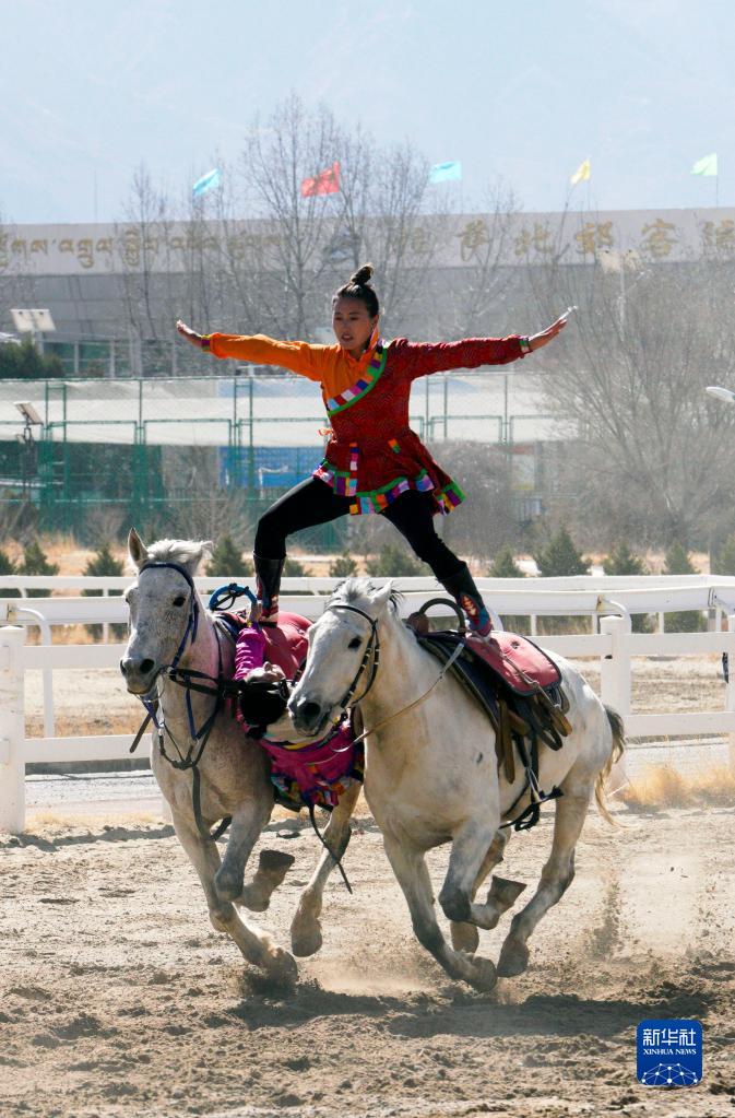 2月23日,騎手進行單人雙馬表演。新華社發(fā)(丁增尼達 攝)