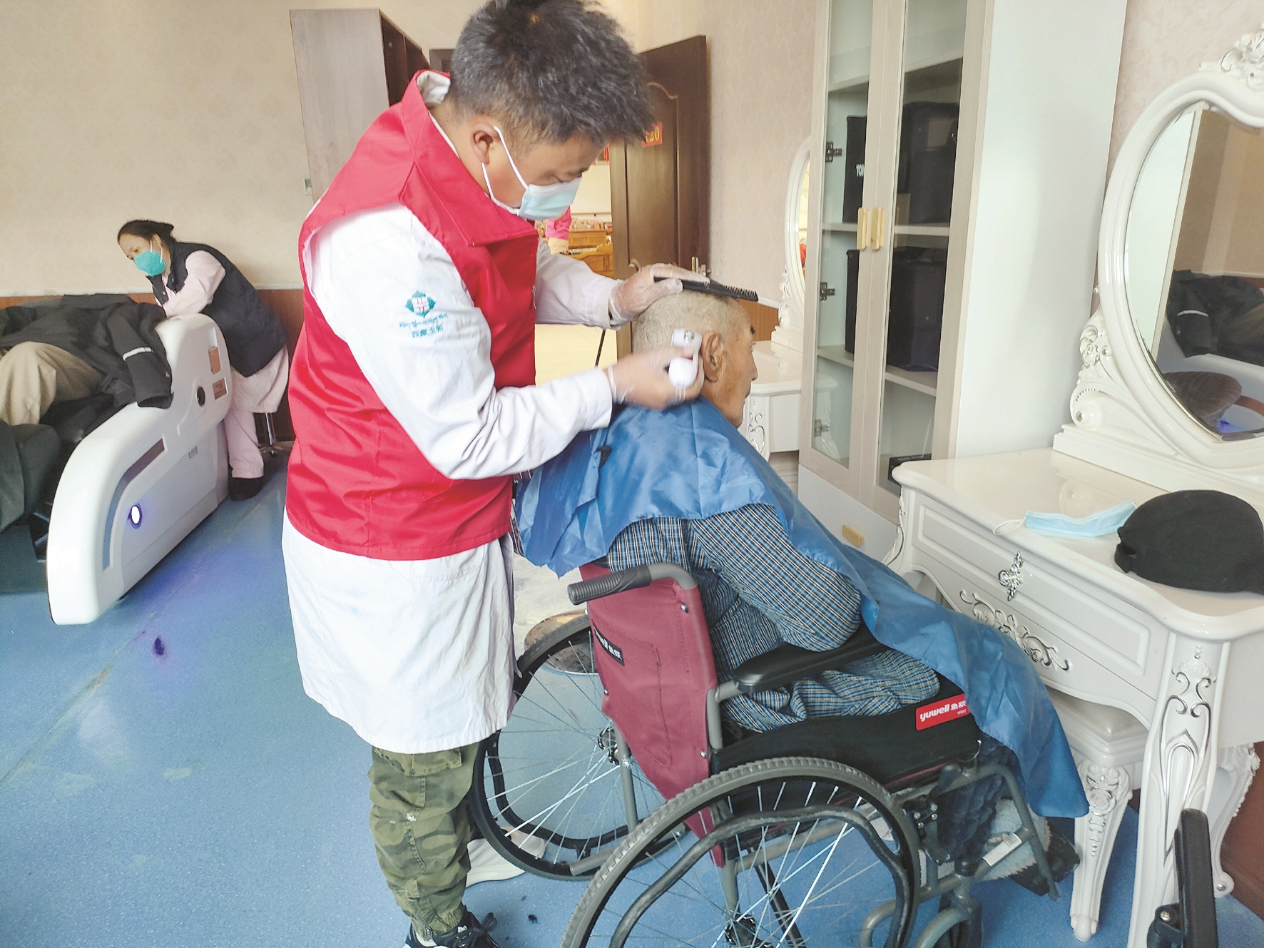 圖為學雷鋒活動日當天,志愿者為市社會福利院老人理發(fā)。 拉薩融媒記者 李從芳攝