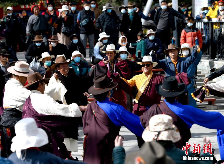3月9日,西藏拉薩,民眾在宗角祿康公園表演朗瑪堆諧。李林 攝