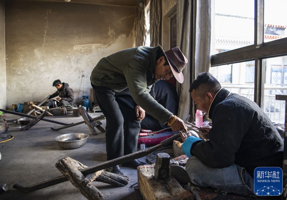 在扎西吉彩金銀銅器廠,廠長拉巴瓊達(前左)在指導年輕的手工藝人(3月9日攝)。