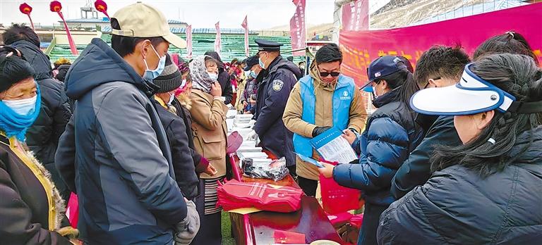 山南市錯(cuò)那縣“鑄牢中華民族共同體意識(shí) 慶祝西藏百萬(wàn)農(nóng)奴解放紀(jì)念日”活動(dòng)現(xiàn)場(chǎng),各宣傳點(diǎn)給群眾發(fā)放宣傳資料。記者 旦增蘭澤 攝