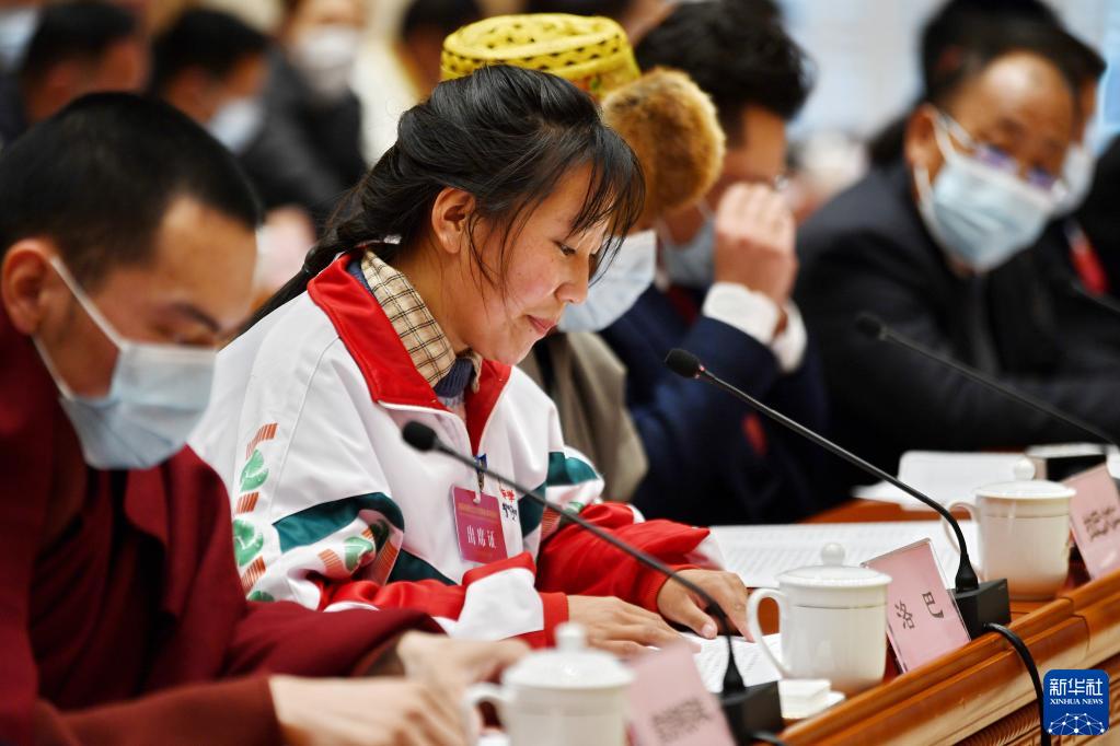 3月28日,拉薩中學(xué)高二學(xué)生洛巴(左二)參加慶祝西藏百萬(wàn)農(nóng)奴解放64周年座談會(huì)時(shí)發(fā)言。新華社記者 張汝鋒 攝