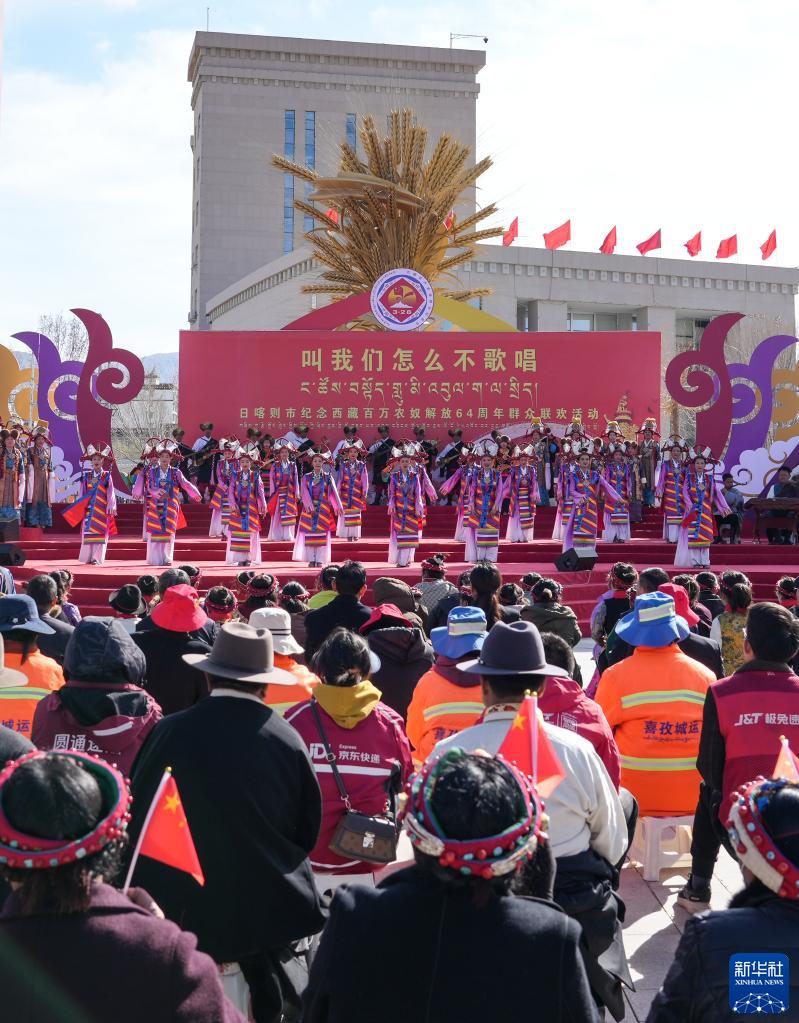 這是3月28日拍攝的日喀則市紀(jì)念西藏百萬(wàn)農(nóng)奴解放64周年群眾聯(lián)歡活動(dòng)現(xiàn)場(chǎng)。新華社發(fā)(何金龍 攝)