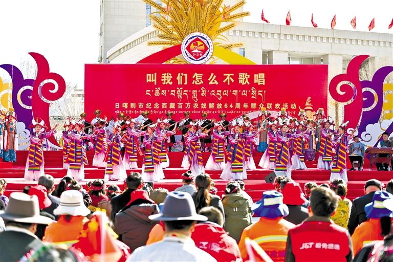 圖為為日喀則市紀(jì)念西藏百萬農(nóng)奴解放64周年群眾聯(lián)歡活動(dòng)現(xiàn)場(chǎng)。