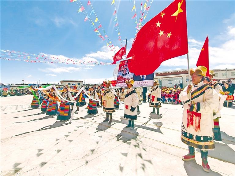 悠揚(yáng)的歌聲獻(xiàn)給黨,歌唱黨的英明領(lǐng)導(dǎo);歡快的舞蹈跳起來,跳出人民幸福生活。從珠峰腳下到年楚河畔,從高原牧場(chǎng)到山谷林地,處處升起面面五星紅旗,贊美共產(chǎn)黨的歌聲響徹天際,匯聚起強(qiáng)大動(dòng)能。