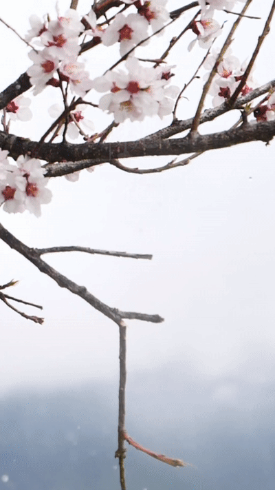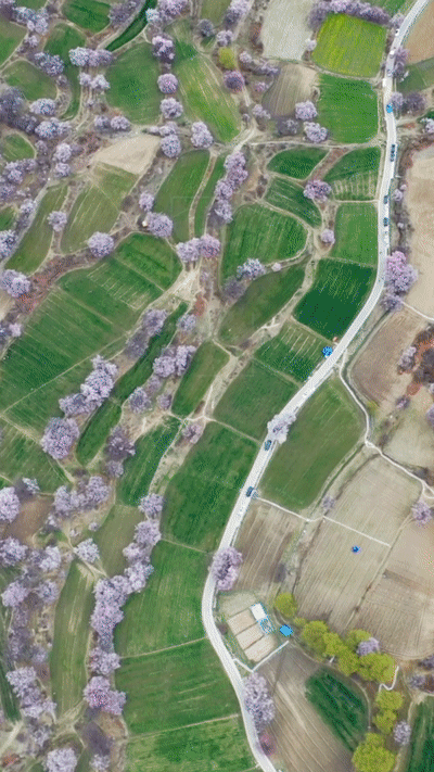 成片的桃花林綿延至河谷山川