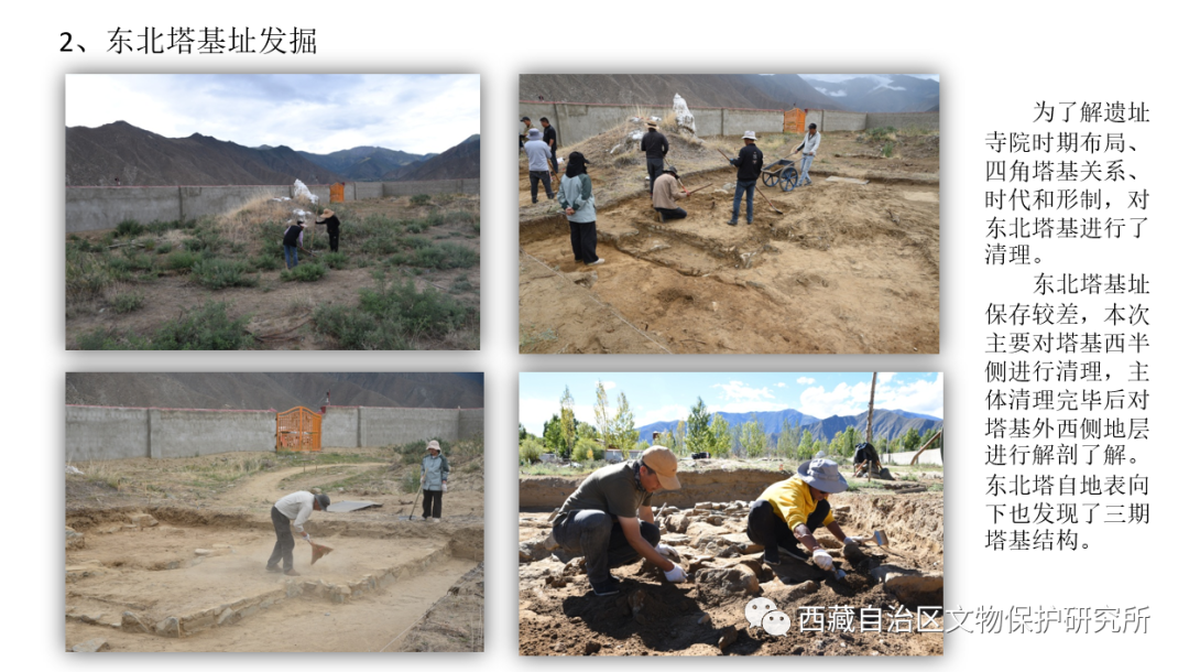 2022年,溫江多考古隊對遺址西南塔北側塔基、東北塔基址進行了清理發(fā)掘,對遺址中區(qū)西部地層進行了解,對遺址南部五峰山部分區(qū)域進行了調查。發(fā)掘面積520平方米,出土磚、瓦、陶、石、骨、鐵等各類遺物標本100件。西南角和東北角兩座佛塔均發(fā)現(xiàn)了上下疊壓的早、中、晚三期塔基,兩座塔基的平面形制和規(guī)格基本一致,均為平面呈多折角“亞“字形,土石結構塔基,邊長均長約18米。遺址中區(qū)西部T0905探方內清理出墻址2處,臺基1處。兩道墻址一為南北向夯土墻,一為東西向石墻,均位于④層下,與晚期塔基為同一時期。臺基1位于⑥層下,北部為一道東西向石砌臺基,內部(南)為五花墊土層,與早期佛塔為同時期。調查工作在五峰山頂發(fā)現(xiàn)修行洞、修行點、小型塔基等共8處,在山北麓發(fā)現(xiàn)依山修建的具有一定規(guī)模的房居址、大型佛塔基址等共5處。