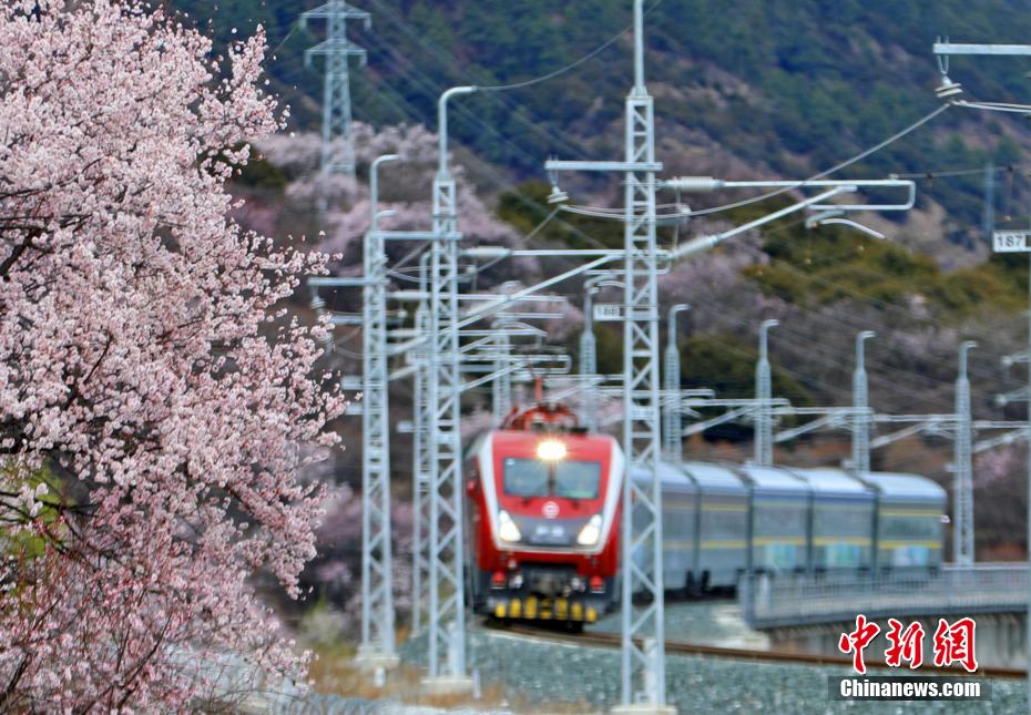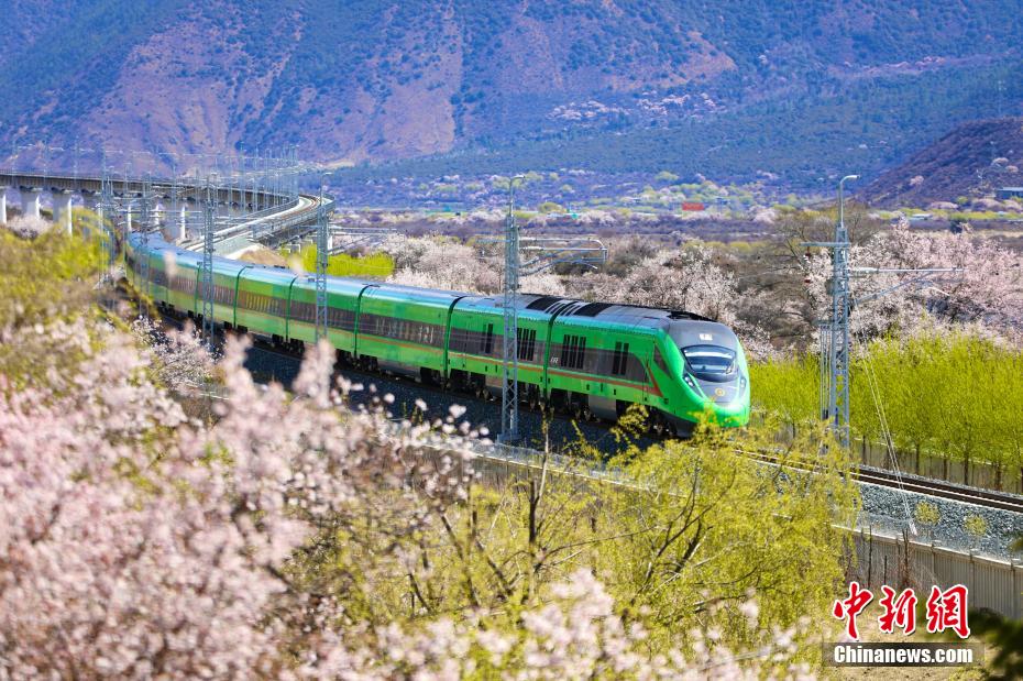 近日,中國鐵路青藏集團有限公司介紹,3月下旬至4月,拉林鐵路沿線綿延的野生桃花林盛開,藍天、白云、桃花、雪山、高原復興號動車等相互交織,形成了一幅幅美不勝收的畫面。圖為穿梭在桃花林中的拉林鐵路高原復興號。
