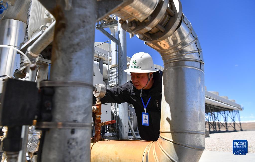 在海拔近4700米的現(xiàn)場(chǎng),記者看到帶著高溫蒸汽的熱水從地下井口涌出,經(jīng)過(guò)設(shè)備分離,高溫高壓的蒸汽和熱水分別從兩個(gè)管道進(jìn)入電廠。在這里,機(jī)器提取熱能用于發(fā)電,然后讓冷卻的尾水通過(guò)管道重新返回地下,形成全封閉循環(huán)再利用模式。