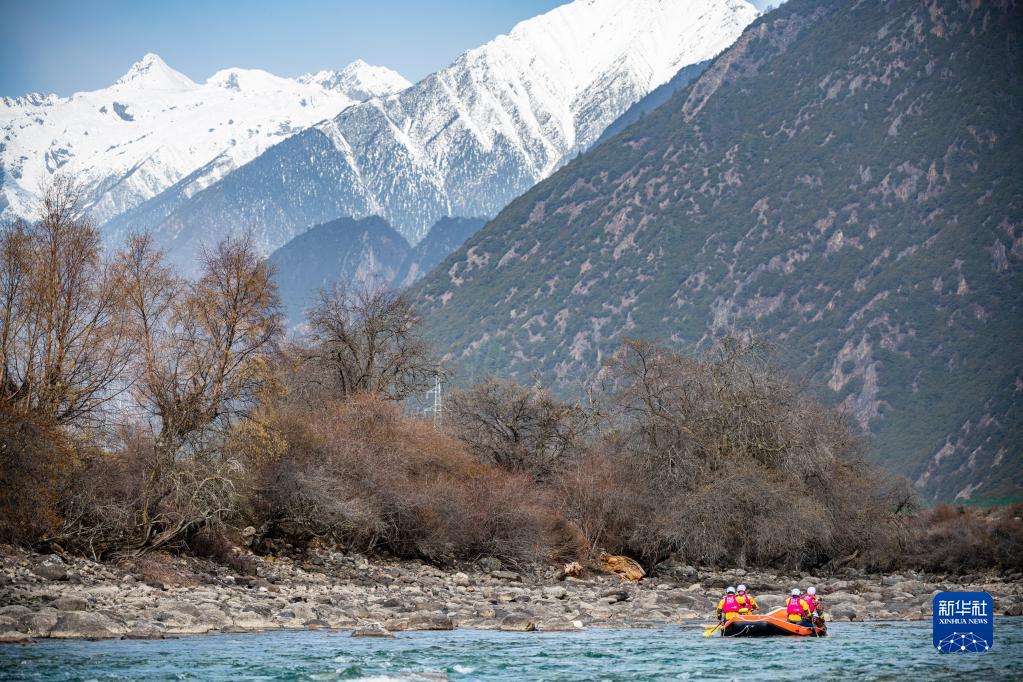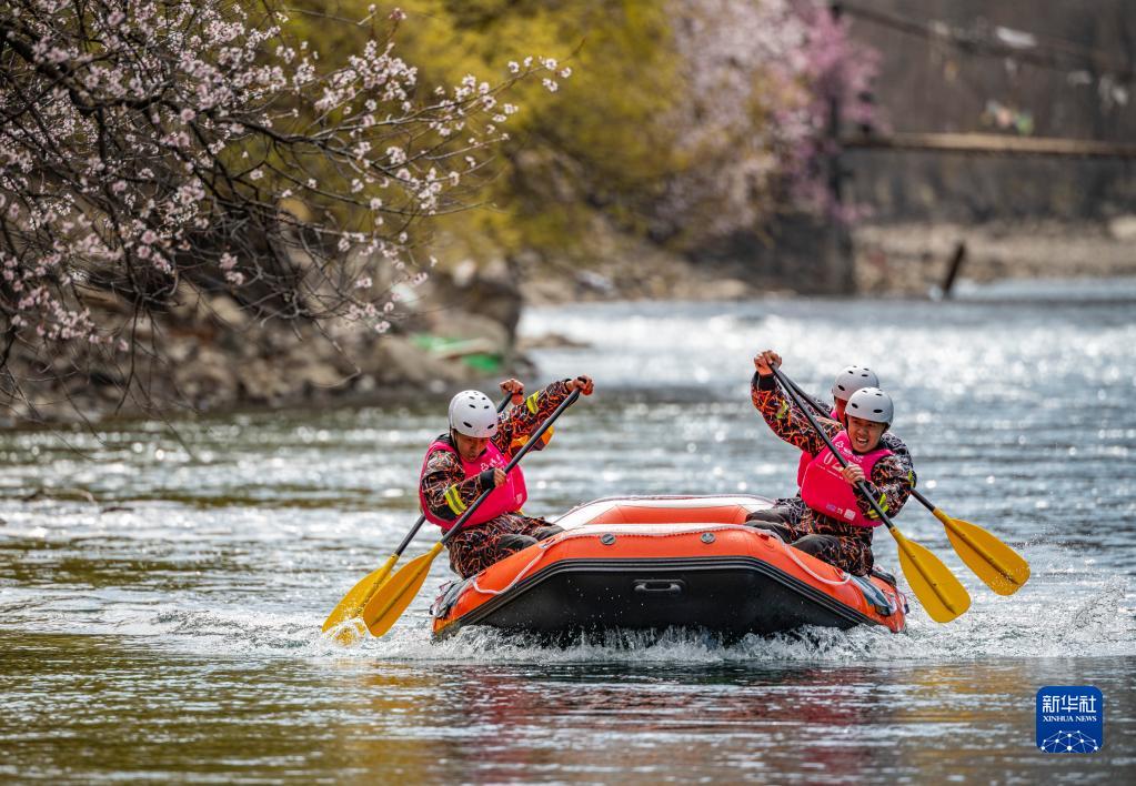 4月16日,西藏旅游股份有限公司漂流隊(duì)(前)在激流漂流筏追逐賽中。最終,他們獲得亞軍。新華社記者 孫非 攝