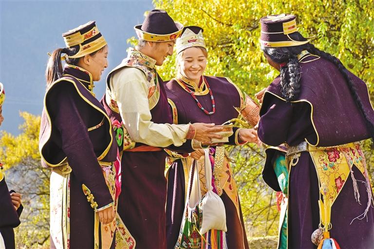 巴宜區(qū)布久鄉(xiāng)擁有濃厚的工布民俗文化氛圍,當?shù)爻浞职l(fā)揮“旅游+民俗文化”的優(yōu)勢,吸引游客前來體驗。圖為布久鄉(xiāng)朵當村身著傳統(tǒng)工布藏裝的村民。