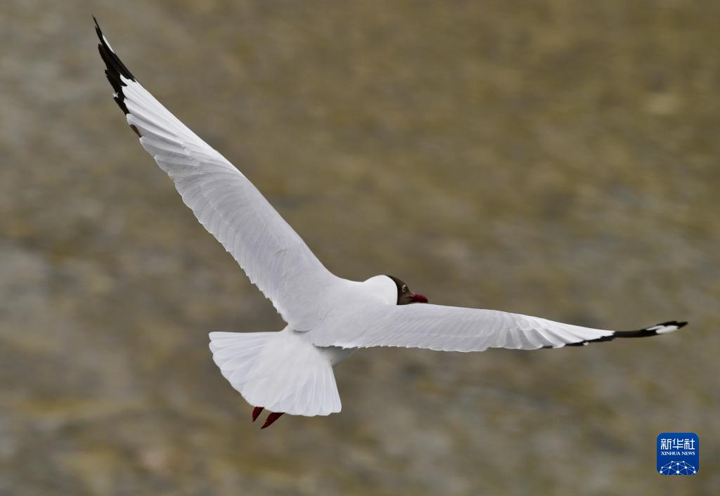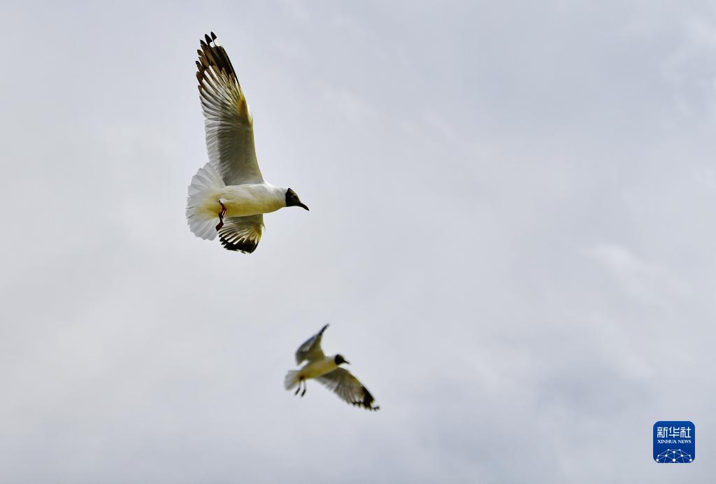 棕頭鷗在拉薩河上空飛翔(4月16日攝)。新華社記者 張汝鋒 攝