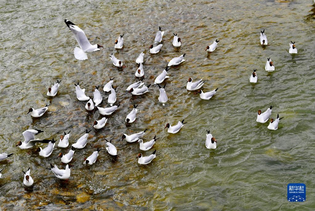 棕頭鷗在拉薩河上嬉戲(4月16日攝)。新華社記者 張汝鋒 攝