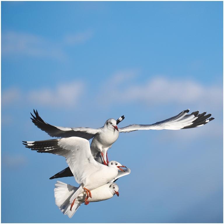 圖為在拉薩河畔,三只紅嘴鷗在空中嬉戲。
