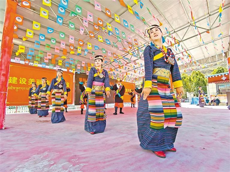圖為瓊結(jié)縣藝術(shù)團(tuán)下鄉(xiāng)演出活動(dòng)中,歌舞《幸福小康》表演場(chǎng)景。記者 巴桑旺姆 攝