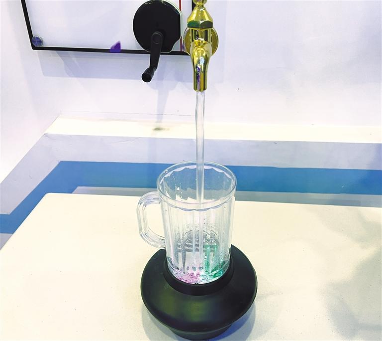 “這個體驗項目叫‘天上來水’。設(shè)計者巧妙設(shè)計水流通過水泵及透明玻璃管壓入水龍頭內(nèi),在封閉的水龍頭出口處將水溢出管口,溢出的水又將玻璃管隱蔽,水流的循環(huán)造成觀眾難以發(fā)現(xiàn)特殊裝置的奧秘,從而形成人為制造的錯覺?!斌w驗結(jié)束后,索央向小朋友解釋“天上來水”的科學原理。