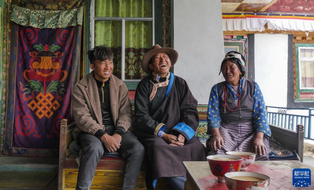 索朗群培(中)和家人在一起(4月19日攝)。新華社記者 劉洲鵬 攝