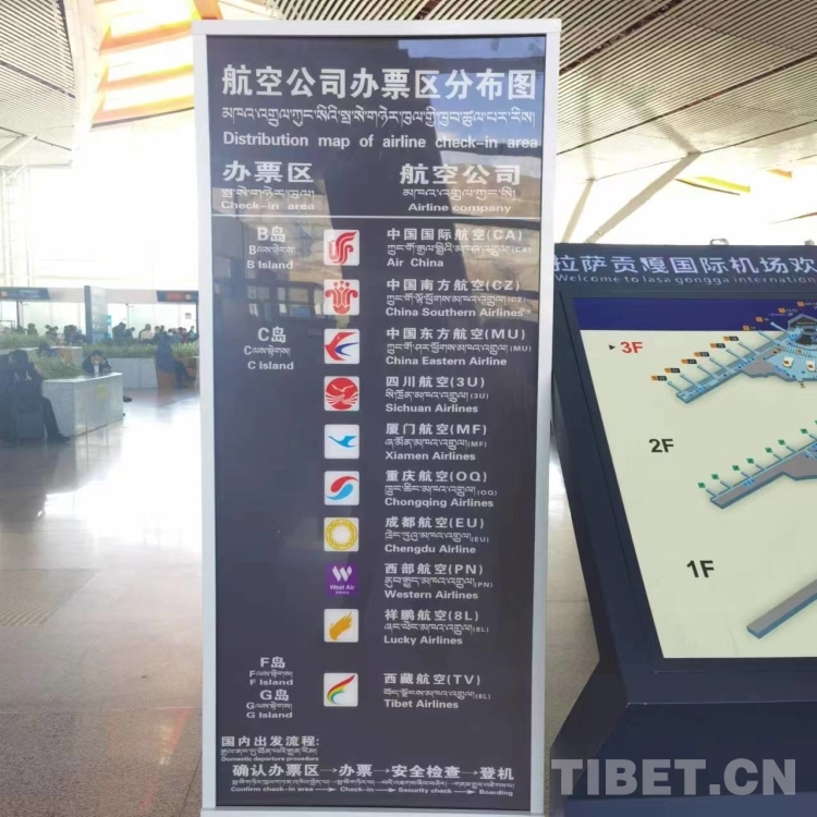 無托運行李的旅客持個人身份證(或有效證件)前往自助值機區(qū)打印登機牌。有托運行李和中轉聯程航班的旅客前往人工柜臺辦理。其中,乘坐西藏航空公司航班的旅客進入出發(fā)大廳后左轉前往F、G島辦理乘機手續(xù),其他航空公司的旅客請前往B、C、D島辦理乘機手續(xù)。