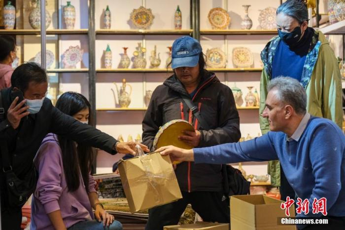 5月4日,西藏(拉薩)中外商品展銷會(huì)現(xiàn)場(chǎng),伊朗商戶哈桑(前排右)給顧客打包好商品,后面貨架是他銷售的伊朗特色工藝品。中新社記者 江飛波 攝