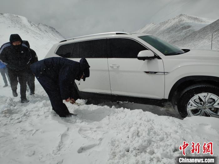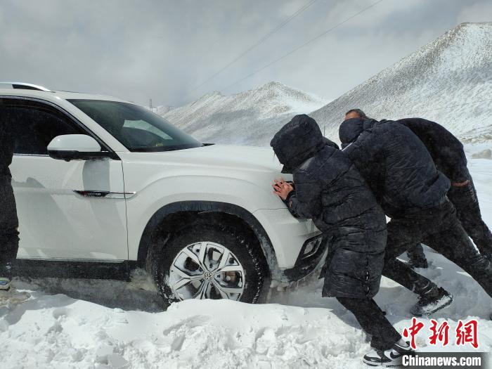 民警隨即打火發(fā)動警車,行至被困車輛前面,利用拖車繩連接警車與被困車輛,其余救援人員雙手搭上車輛用力向前推,“一、二、三,加油!”“動了,動了,車子可以向前移動了?!辩P除積雪、鋪撒砂石、推拉車輛……接下來救援人員用同樣的方法開始拖出其余車輛,3個多小時后,5輛車、14名民眾全部脫離險境。所有被困車輛和人員安全抵達楚魯松杰鄉(xiāng)。
