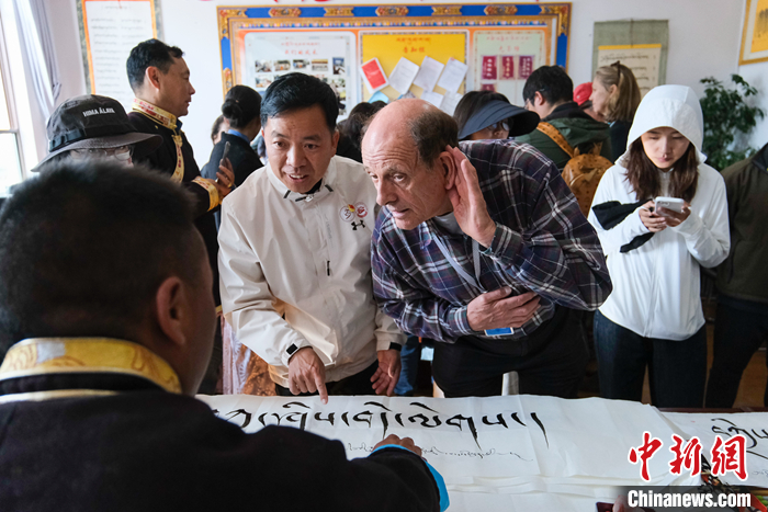 圖為5月18日上午,參訪團(tuán)成員柯馬凱(Michael Crook)側(cè)耳傾聽(tīng)藏文書(shū)法老師的講解 中新社記者 江飛波 攝