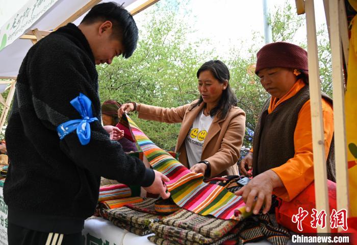 圖為活動(dòng)市集中,游客了解藏族手工氆氌。趙朗 攝