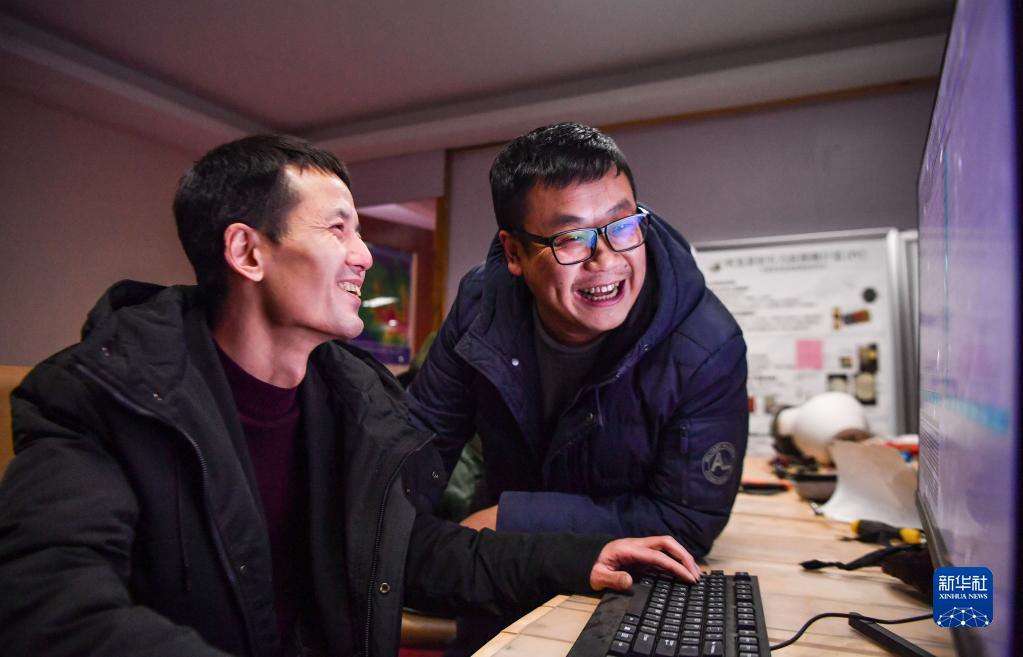 尤顯龍(左)和同事唐鵬在調(diào)試望遠(yuǎn)鏡(5月23日攝)。新華社記者 晉美多吉 攝