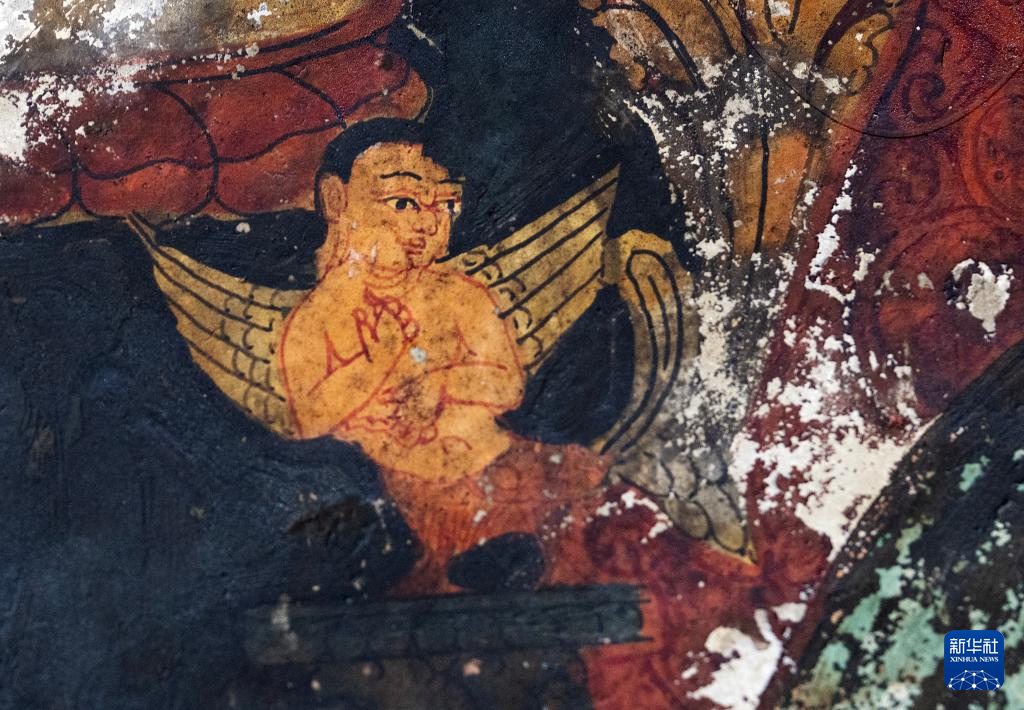 這是5月26日拍攝的皮央石窟壁畫中的長翅膀的人物造型。新華社記者 費茂華 攝