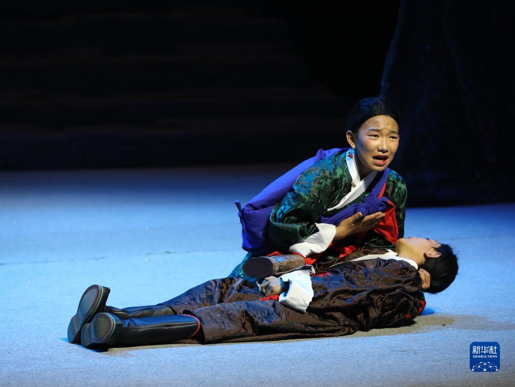 13歲的小演員旦增夢朗身著深綠色藏戲服飾,跪在舞臺(tái)中央,眼角噙淚,緊摟著失去意識的弟弟……低沉、哀慟的藏戲唱腔,舞臺(tái)兩側(cè)實(shí)時(shí)滾動(dòng)的字幕,看哭了不少觀看試演的觀眾。